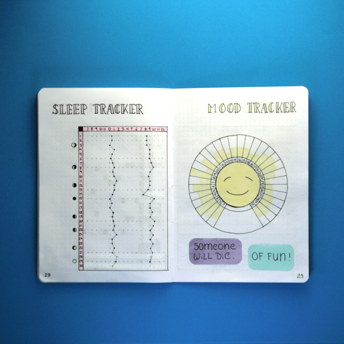 I honestly did not expect the mood tracker to end up how it did when I started designing it. I knew I wanted it to be a circle and only while working on it realized that I was going to create rays of sunshine! So I quickly added a yellow center with a little face. It also just happened to be that I landed on a yellow them for that page (I was going for a pastel rainbow in the month of April) – what a lucky moment!