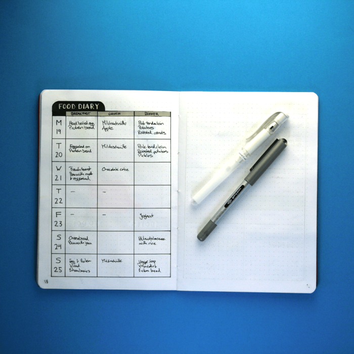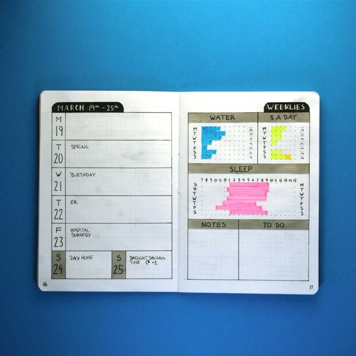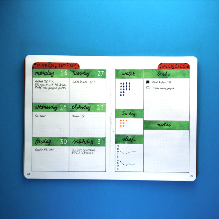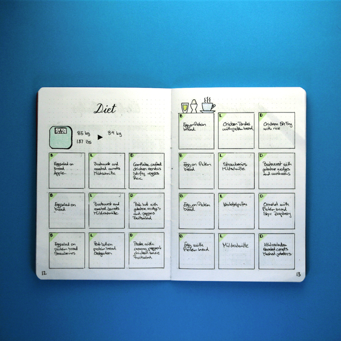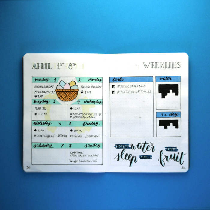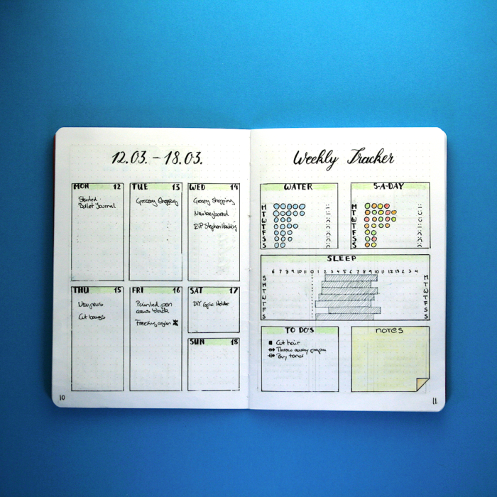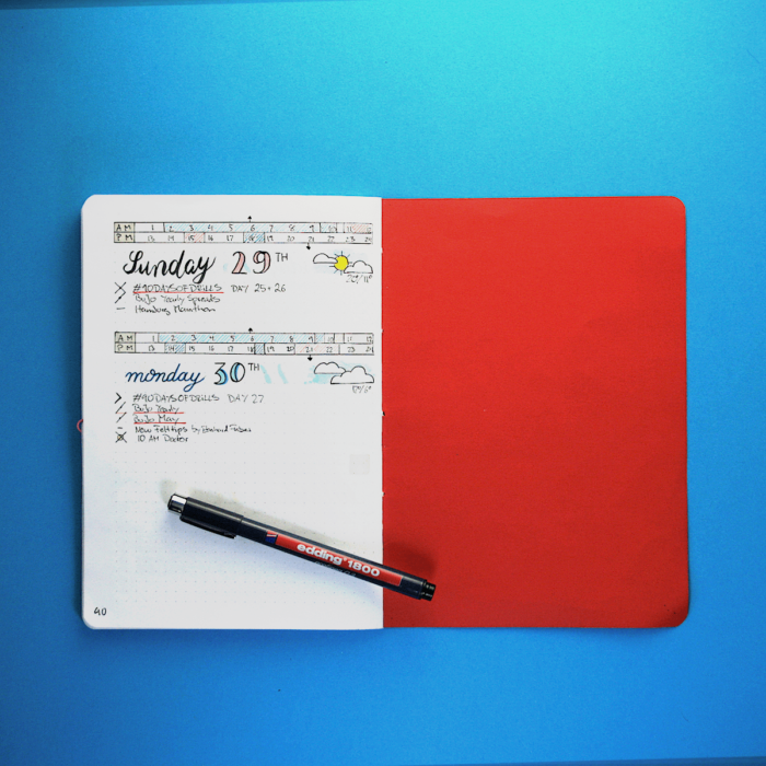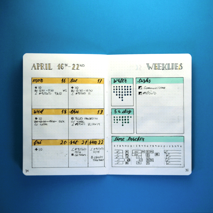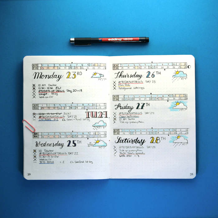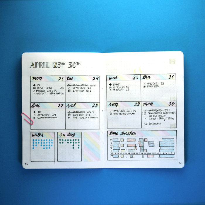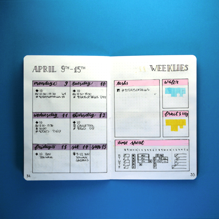 It was actually an advantage to fit 8 days into one page, it didn’t make sense to exclude the last day as a Monday from the spread. So I had a nice amount of space for each day and simply fit the water and 5-a-day tracker under it as well as a time tracker. I had used a time tracker on the previous weeks as well, but adding color coding made it a lot more enjoyable.