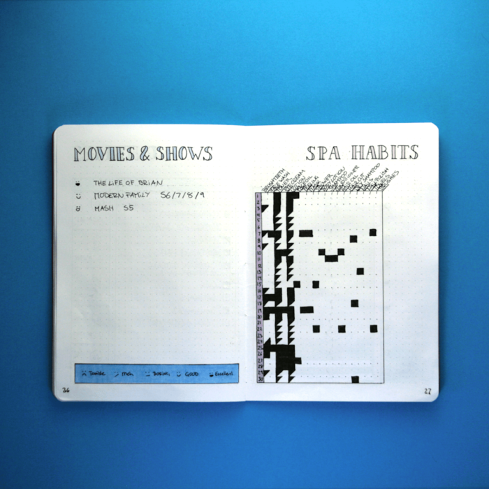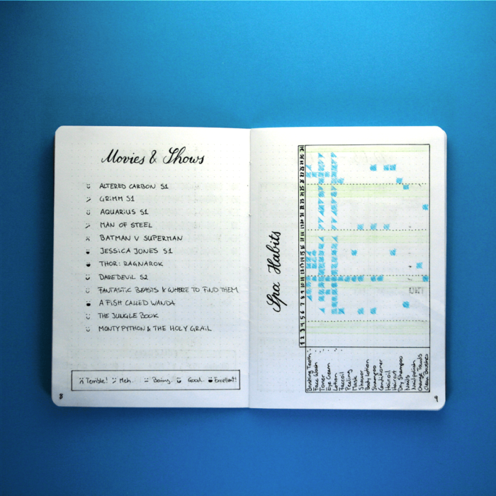 This is one of my March tracker spreads with Movies & Shows I watched and my so-called Spa Habits, in which I track my bathroom routines.